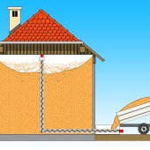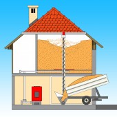 Складське приміщення над котельним. Подача за допомогою спускної труби.