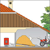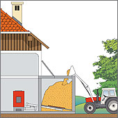 Нова система загрузки від Hargassner дозволяє нарешті автоматичну загрузку трісок у важко доступні складські приміщення, як напр.: склад на верхніх поверхах чи без відповідної можливості доступу. Загрузочна ємність постачається в двох можливих довжинах, 2 м і 2,5 м. Вона може також встановлюватись нижче рівня землі. Додатково може поставлятись ємність з насадними рамами, боковими стінами та відкидною кришкою для зручної подачі. Вертикальний шнек може бути до 8 м висотою з регульованим виштовхувачем для кращого розподілення трісок, відповідно до позиції шнека та форми складського приміщення. Продуктивність транспортера до 50м3/год., в залежності від якості трісок. |