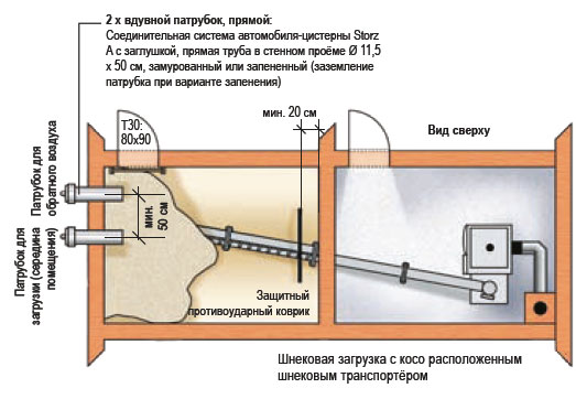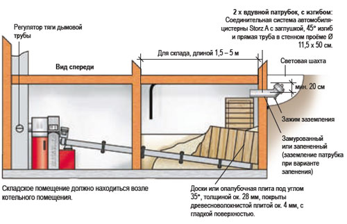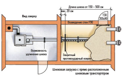 При оптимальному розміщенні котельного і складського приміщень один біля одного подача пелет проходить з допомогою шнекового транспортера системної конструкції прямо в опалювальний котел.